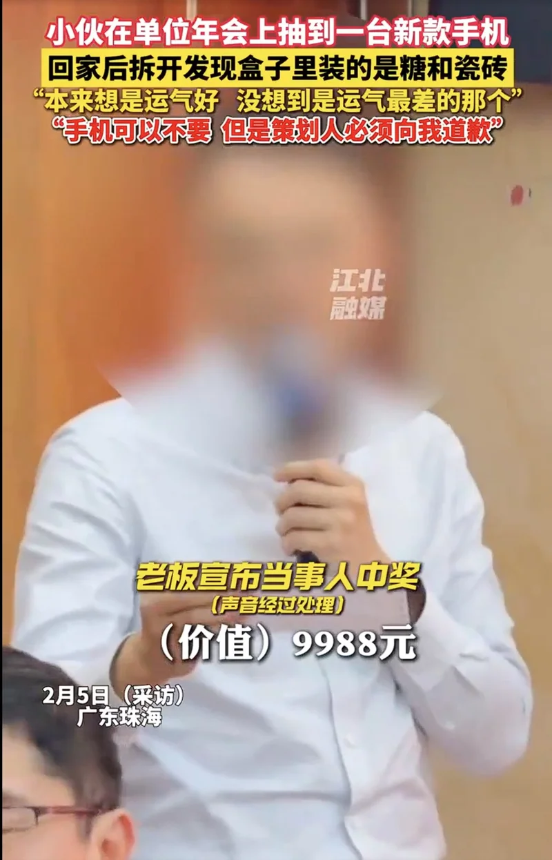 2月5日(采访时间),广东珠海。小伙在单位年会上抽到一台新款手机,回家拆开发现盒子里装的是糖和瓷砖。当时人江江称,公司年会上抽到了特等奖,中奖后他未当场拆开,想拿回家给媳妇一个惊喜。回家拆开后,发现里面装的竟是砖块。“策划人承认是他的整蛊,并不是针对我,只是想在年会上活跃一下气氛。”江江说,本来以为自己运气好,没想到是运气最差的那个,手机可以不要,但对于这场让自己空欢喜的整蛊,策划人必须向他正式道歉。