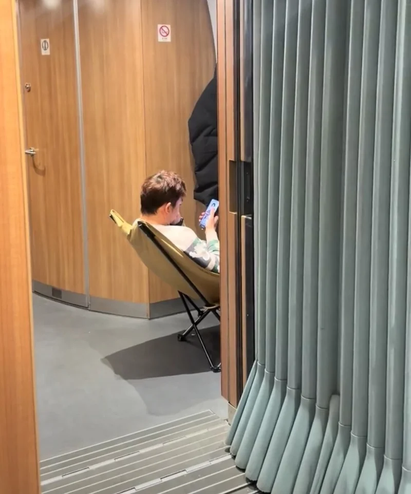 1月31日,浙江一网友在社交平台发布的一段高铁视频,引发关注。视频画面中,一名男子在高铁两节车厢连接处,惬意地靠坐在折叠椅上玩手机,悠然的状态被网友拍摄下来发到网上,并配文“高人呀,这才是坐高铁的正确方式”。