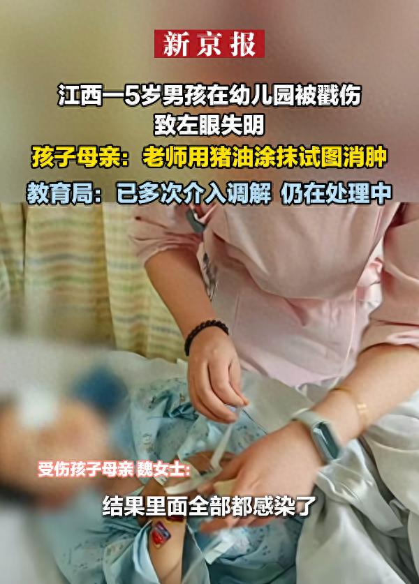 男孩在幼儿园被戳伤左眼 老师竟抹猪油消肿 失明(图) Source 10月9日,有江西瑞昌一家长称,孩子在幼儿园被同学戳伤眼球致左眼失明,幼儿园老师给孩子伤口涂抹了猪油试图消肿。 孩子母亲魏女士称,“幼儿园老师看着眼睛房水流出来,反而给我孩子的眼睛擦猪油消肿,结果里面全部都感染了,我的孩子当场失明”。事发后魏女士与园方签订了调解协议,园方向魏女士支付了医药费约272万元,但孩子治疗仍需要多次手术,后续医疗费用面临难题。 瑞昌市教育局工作人员告诉新京报记者教育局已多次介入调解,此事仍在处理中。魏女士表示,后续将考虑通过司法途径维权。