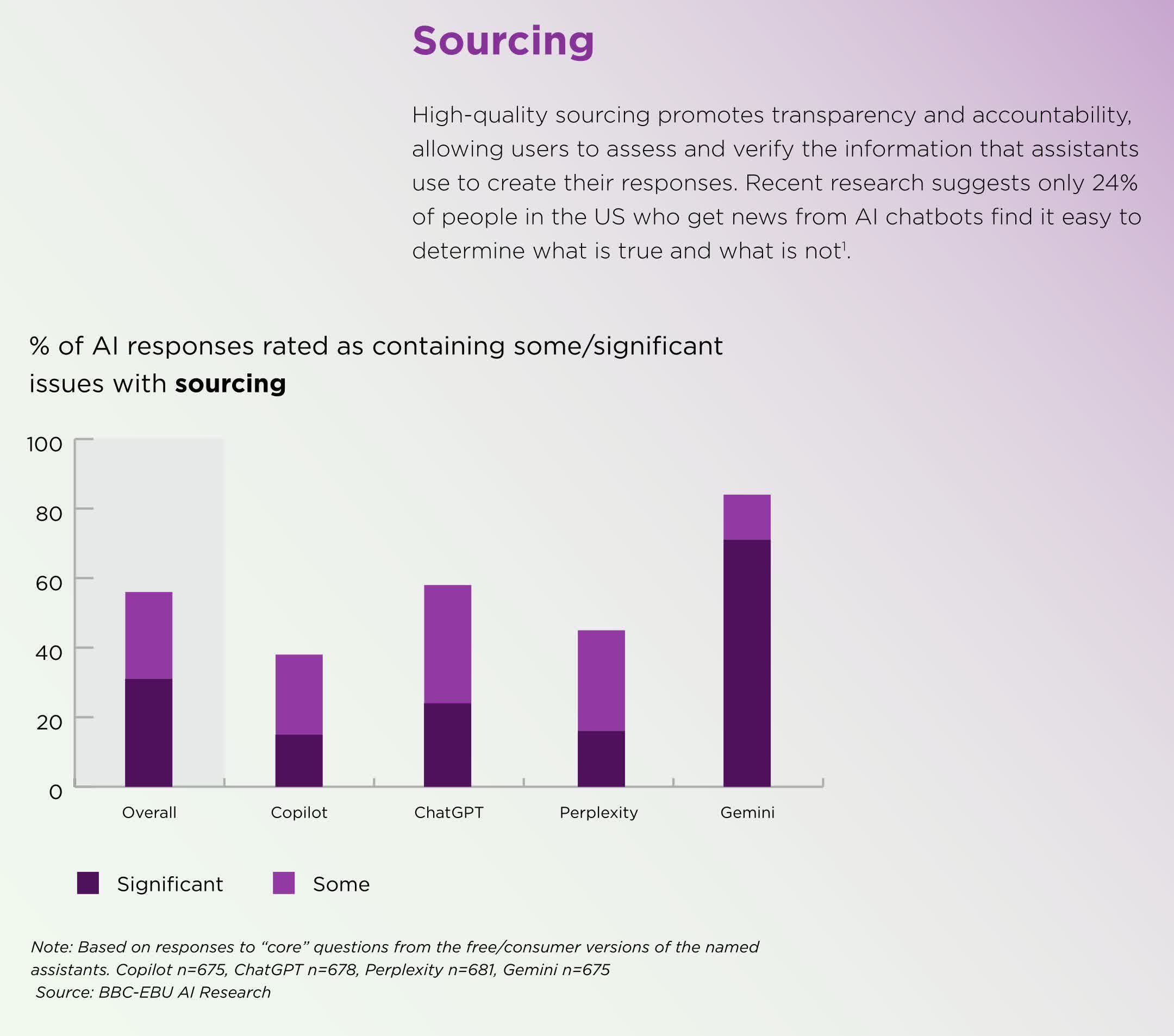 报告还显示,这些问题不仅局限于某一地区或语言,全球范围内都很普遍。其中Google的Gemini准确性最低,其回应中有高达72%存在显著的来源错误。OpenAI此前曾将此类错误归咎于早期版本仅训练至2021年9月,未能获取实时互联网信息,但目前已不适用,因此问题极有可能源于算法本身,难以通过数据更新根治。