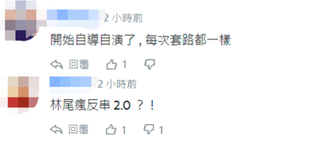 更有网友联系到了去年亲绿写手林玮丰“自导自演”“大陆对台发动攻击进行‘认知作战’”的闹剧:“(民进党)开始自导自演了 , 每次套路都一样”、“林尾疯(指林玮丰)反串 2.0 ?!”↓