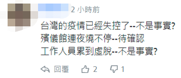 还有网友表示,“台湾的疫情已经失控了不是事实?殡仪馆连夜烧不停有待确认,(但)工作人员累到虚脱不是事实?”↓