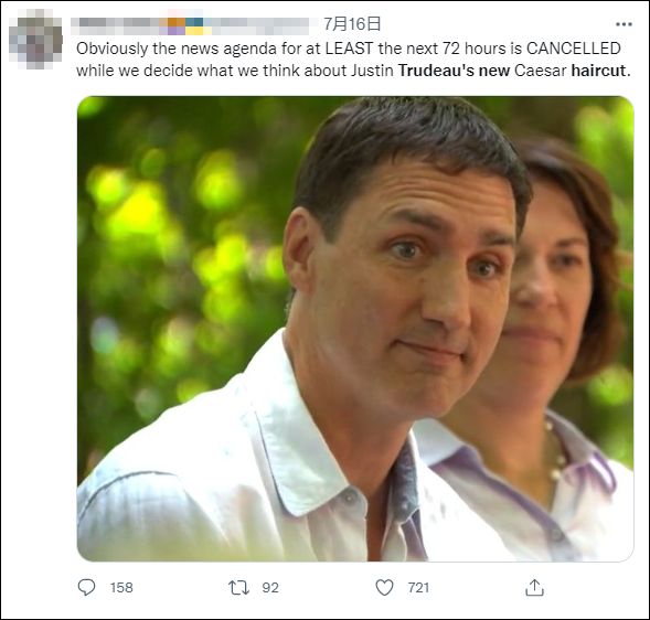 有人推测特鲁多剪新发型是为了转移注意力:“显然,在我们决定对贾斯汀·特鲁多的新‘凯撒发型’的看法时,至少接下来72小时里的新闻议程都被取消了。”