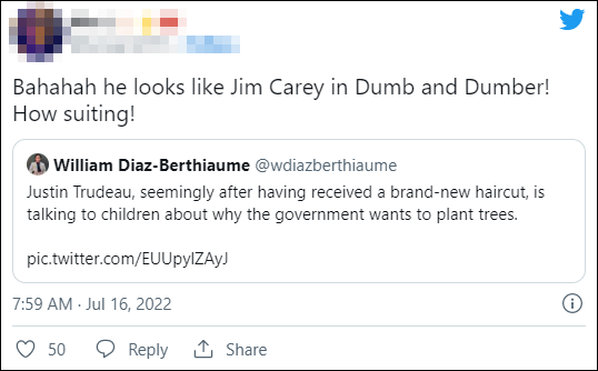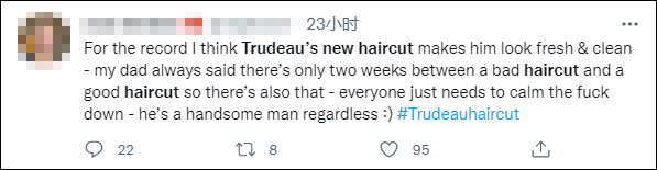 “分享下我最有争议的推文:特鲁多的新发型很好。”