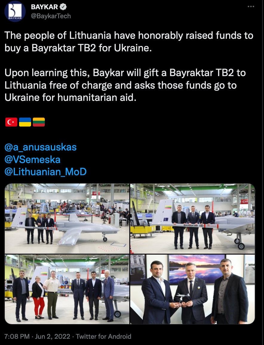 推文写道,“立陶宛人光荣地筹集资金为乌克兰购买Bayraktar TB2无人机。得知这一消息,公司决定免费赠送一台 Bayraktar TB2无人机给立陶宛,至于那些众筹款就用于对乌克兰进行人道主义援助。”