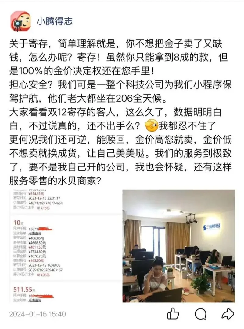 消费者把自己的实物黄金快递给平台寄存(黄金发快递,心也是够大的),平台按照回收价的80%打款,用户之后可以按市场价选择赎回或卖出,平台补上差价。