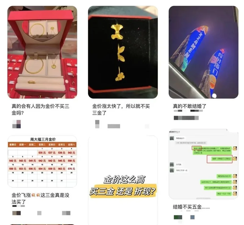 已经结了婚的,后悔三金买少了;在筹办婚礼的,害怕三金买贵了。