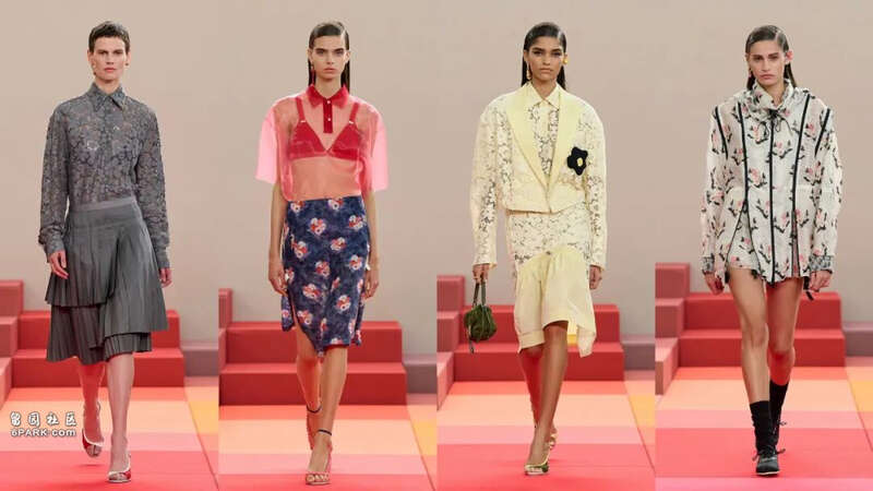 短袖连身工作服配以皱褶丝质手套;各式印花与材质在中长裙与放大比例的连身裙上激烈碰撞。军事感衬衫叠穿开襟冷衫与悬垂裙装,场上节奏旋即过渡至满布镶饰的裙装、带口袋的热裤与加大版风衣。松垮胸围、泡泡裙与皮革小袋在淡彩万花筒中闪烁,每一处细节都透着灵动。