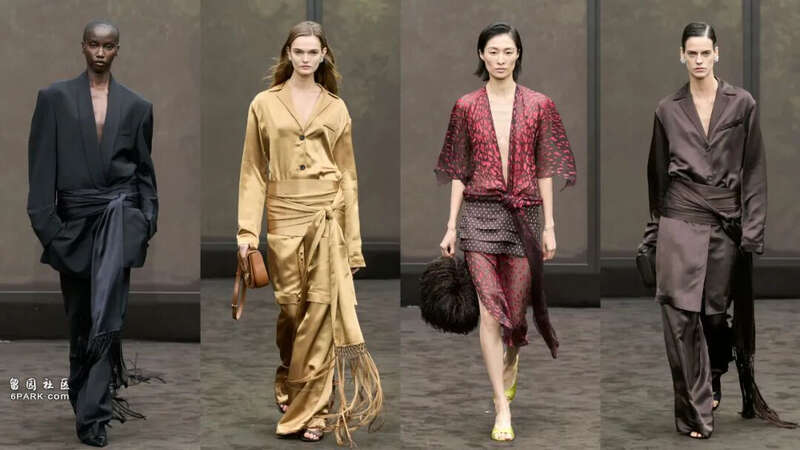 本季以皮革为灵感核心,76个男女装造型暗藏Intrecciato 编织工艺,皮革拼接为传统材质注入新活力;流苏、羽毛搭配降落伞丝、回收玻璃纤维,平衡皮革利落感,呼应永续理念;手袋设计致敬经典,重绎 1966-1977年Lauren包等,新增实用款,模特随性拎握尽显 “慵懒精致”,将品牌精神淋漓尽致展现无遗。