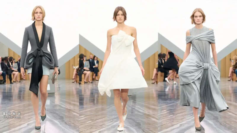随着灯光的亮起,模特儿穿着Jonathan Anderson设计的白色裙装缓缓踏上伸展台。这条裙装以对角线形式点缀着两个可爱的蝴蝶结,形成优雅的垂坠线条,既俏皮又优雅,展现了本系列中大量蝴蝶结和缎带元素,为Dior的经典线条注入了一丝浪漫。而蝴蝶结元素不止作为点缀,Anderson为其赋予了廓形感,它出现在收腰夹克的下摆和披肩的轮廓之上,由此引入了一种全新的剪裁和塑形方式。