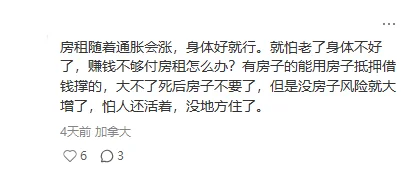 更扎心的是财务风险:「房租随着通胀会涨,身体好就行。就怕老了身体不好了,赚钱不够付房租怎么办?有房子的能用房子抵押借钱撑着,大不了死后房子不要了,但是没房子风险就大增了,怕人还活着,没地方住了。」