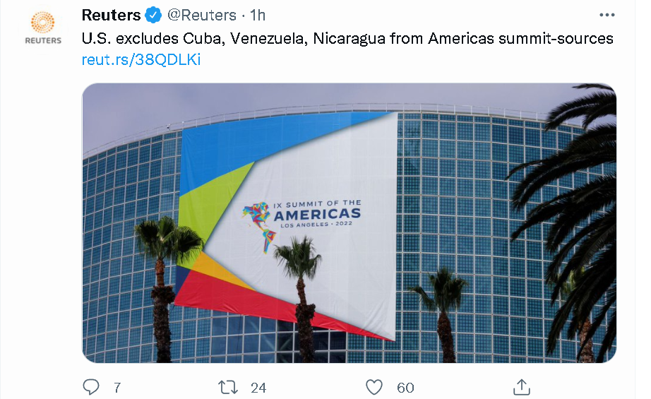 据英国路透社当地时间5日报道,美国总统拜登已经正式决定不邀请古巴、委内瑞拉和尼加拉瓜的政府官员参加将于6月6日在美国洛杉矶拉开帷幕的第九届美洲峰会。