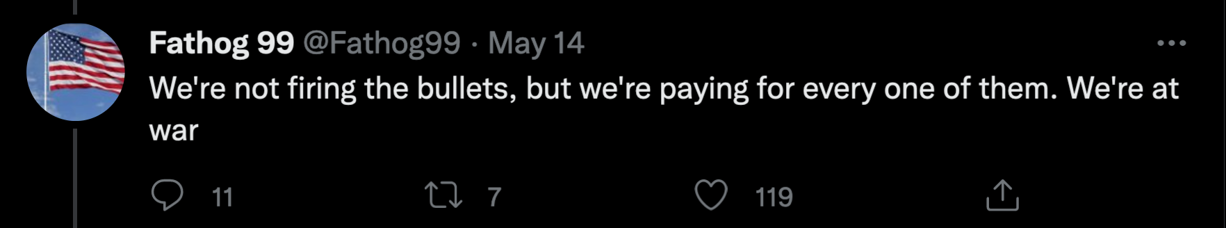 还有人解读说,“尽管我们没有发射子弹,但我们每个人都在为此付出代价,我们正在战争中。”