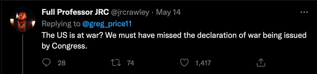 有人则认为,“战争”这个词其实用起来没那么严格,虽然美国没有发布战争宣言,但有时冲突就会被称作战争,况且霍耶也没有说美国正处在战时状态。