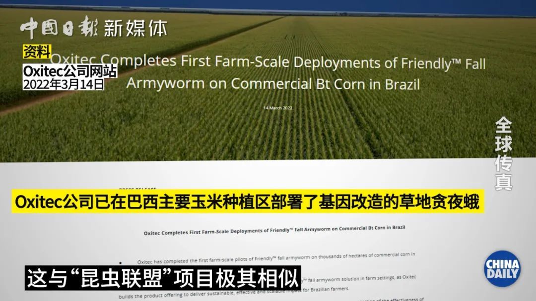 再看Oxitec公司旗下的其他业务,它们已经在巴西的一个玉米种植区释放了转基因昆虫。这与“昆虫联盟”项目极其相似。