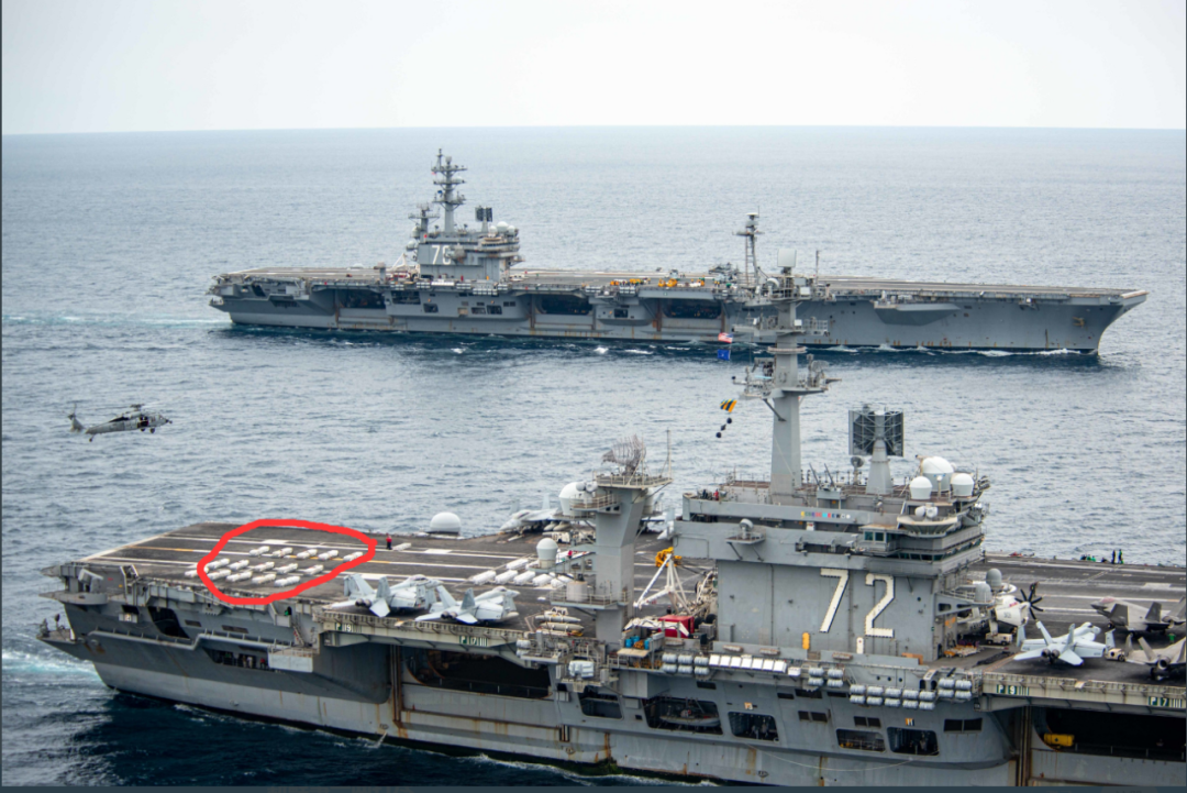 但有一个非常有意思的细节,就是在上上图中,“林肯”号航母甲板上放置着大量白色装置,估计应该是“海鹰”直升机进行垂直转运的物资,但从视觉角度来看,却不禁让人替美国人的这场演习捏一把汗——非常像是放置了大量裹尸袋。