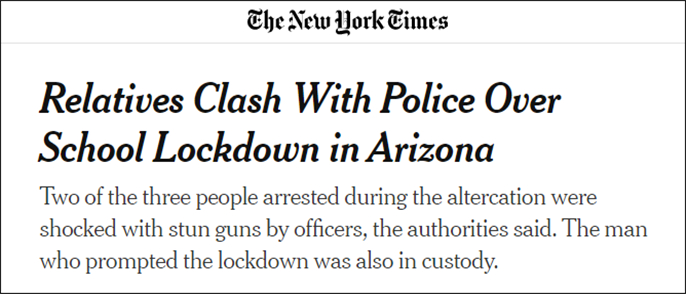 据报道,有3名家长试图强行进入学校保护孩子,但最终被警方逮捕,其中2人还遭到警方用泰瑟枪枪击。之后,引发封锁的男子也被拘留,没有儿童或教师受伤。据《纽约时报》称,有人表示,家长的这种反应是得州小学枪击案的“直接副产品”。一名教授也表示,家长和警方的冲突表明,民众对执法部门处理类似校园突发事件的信心正在下降,“这些父母不相信警察了。”