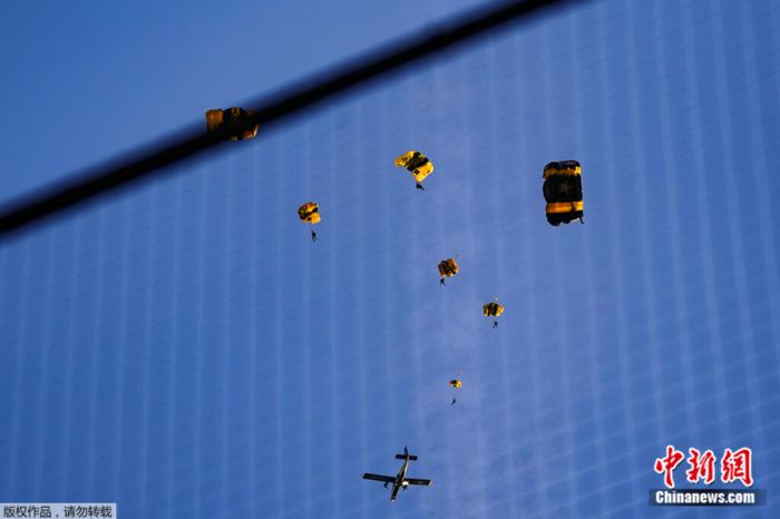 当地时间4月20日,美国陆军黄金骑士队队员跳伞进入华盛顿国民球场,该场地距离国会大厦仅1英里(约1.6千米)左右。