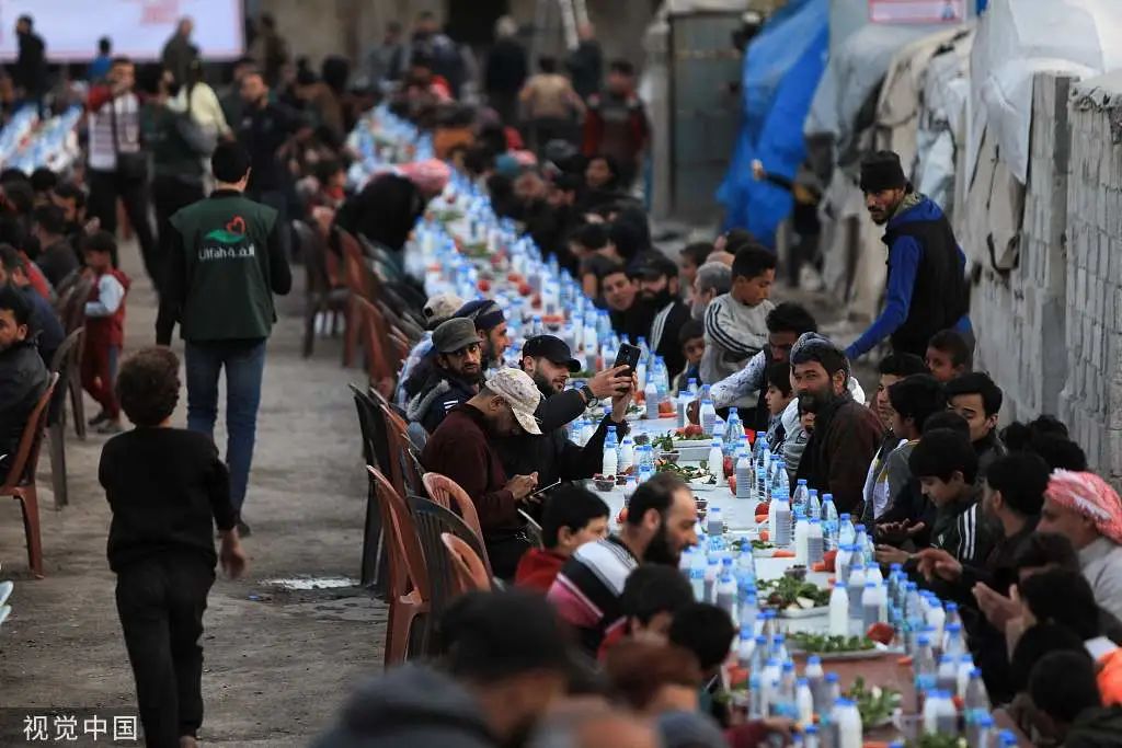当地时间2022年4月7日,叙利亚巴卜,斋月期间,当地流离失所的叙利亚民众用开斋晚宴。