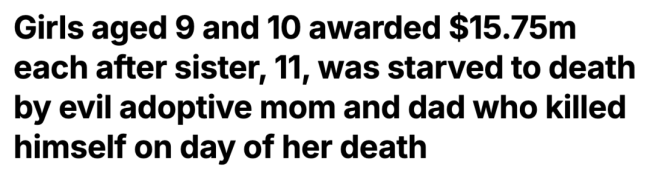 美国11岁女孩被养父母活活饿死!9岁和10岁的妹妹们获赔3150万美元!