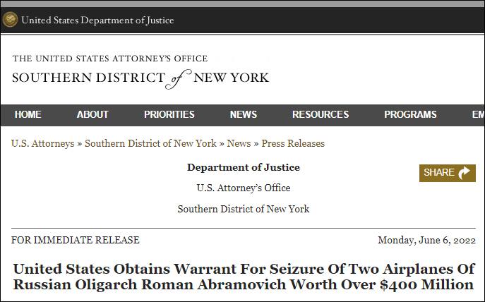 阿布拉莫维奇本人并未受到美国财政部海外资产控制办公室的制裁,一名美国司法部官员宣称,没收其财产表明“没有人可以凌驾于法律之上”。