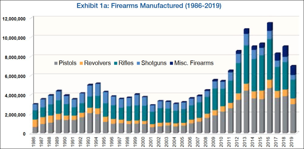 这份由美国烟酒枪炮及爆炸物管理局(ATF)发布的报告显示,美国枪支市场正持续扩大,每年的枪支制造量从2000年的390万支增长到2020年的1130万支。ATF官员表示,由于美国生产的枪支出口到海外的比例并不高,因此这些数字可以较为准确地反映美国国内的枪支市场。