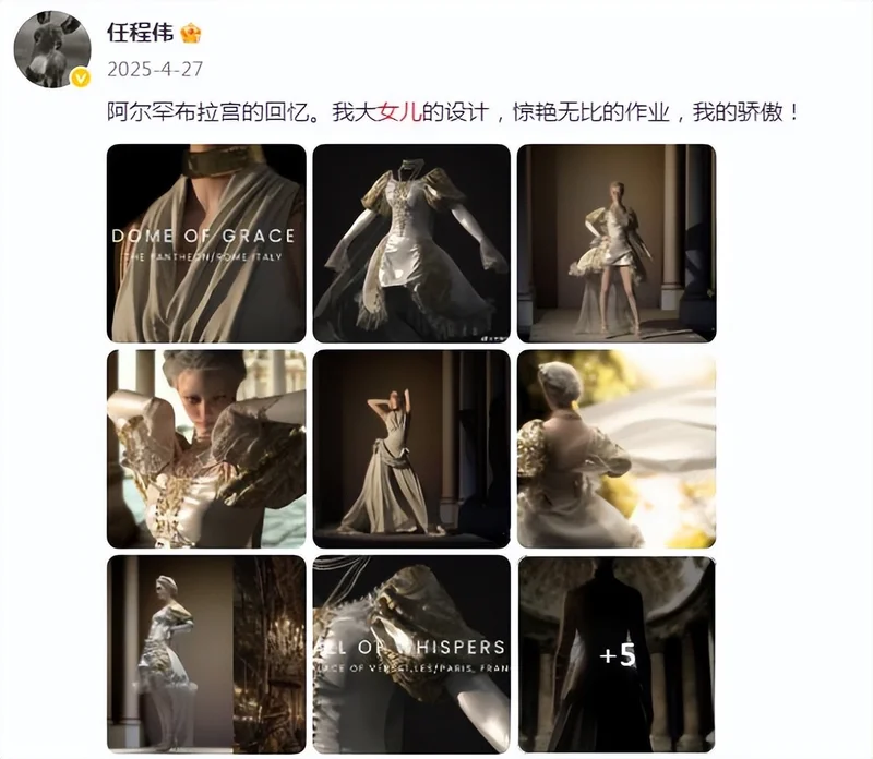 据悉,任程伟和黄蕾有两个女儿,之前任程伟还在社交平台晒出大女儿设计的礼服,他还附文写道:“我大女儿的设计,惊艳无比的作业,我的骄傲。”