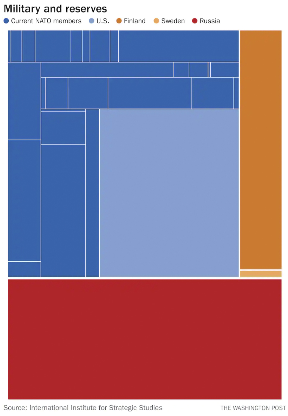 现北约成员国外加芬兰、瑞典,与俄罗斯的军力储备对比。其中,红色模块代表俄罗斯。图片来源:国际战略研究所;《华盛顿邮报》制图
