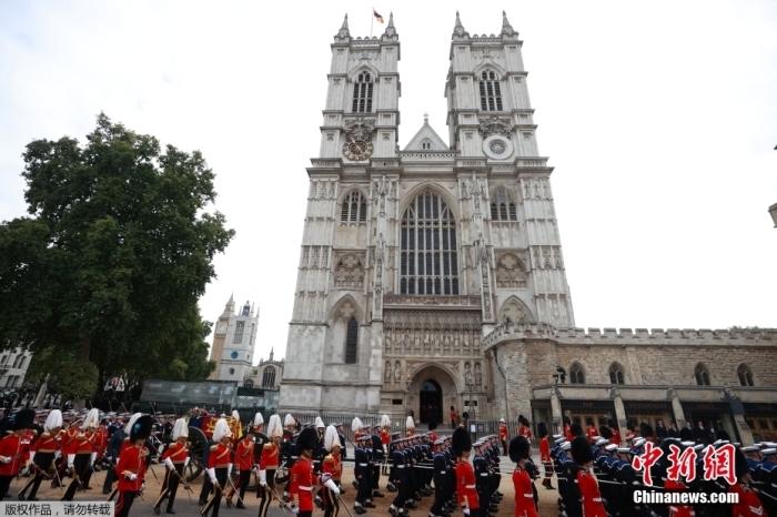 当地时间19日11时左右,英国女王伊丽莎白二世的国葬在伦敦威斯敏斯特大教堂正式举行,仪式将持续约一小时。图为英国女王伊丽莎白二世的灵柩被抬往威斯敏斯特教堂。