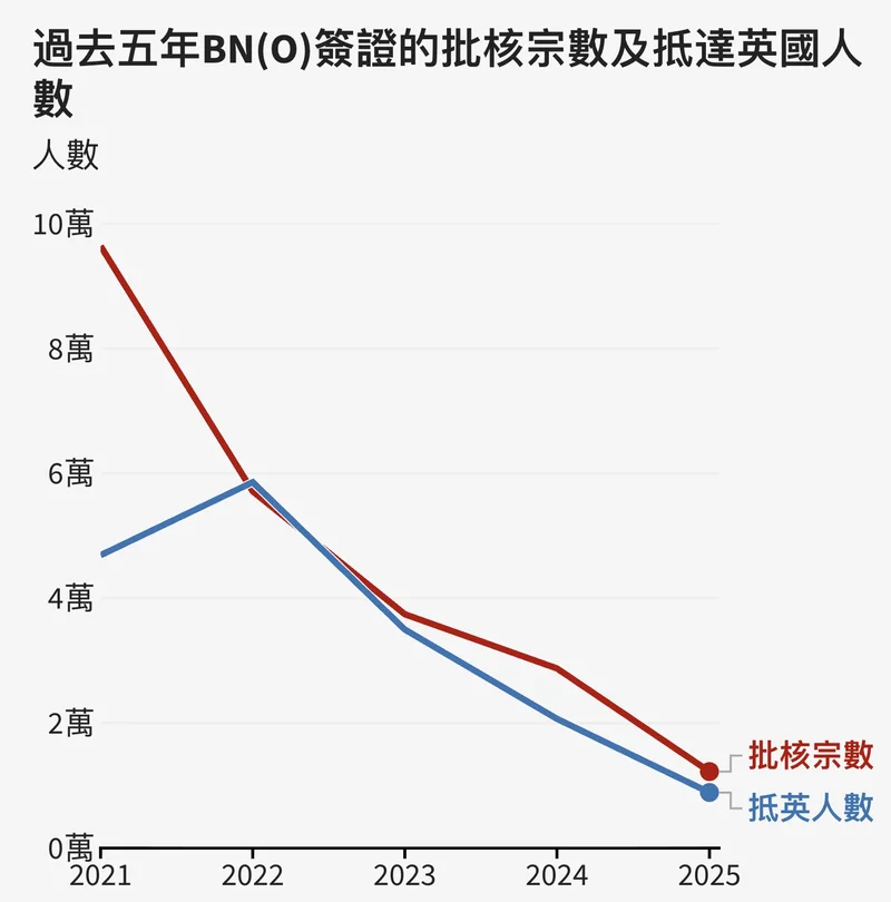 根据英国内政部数据,截至2025年9月,总共接获约23.8万宗BN(O)签证申请、并已批出约23.2万宗申请,有17万人已抵达英国。每年申请的宗数呈下降趋势。