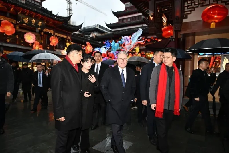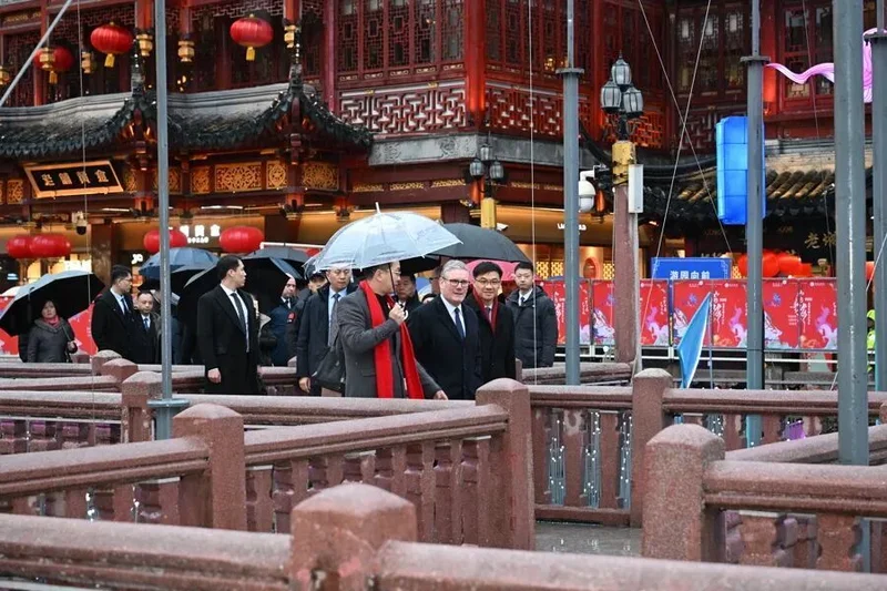 1月30日下午,天空下着细雨,英国首相斯塔默一行来到豫园,逛九曲桥,进湖心亭,与市民交流,感受中国传统文化。