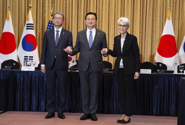 8日,韩国外交部第一次官赵贤东(中)、美国常务副国务卿舍曼(右)和日本外务省事务次官森健良参加于首尔举行的韩美日副外长会议。(美联社)