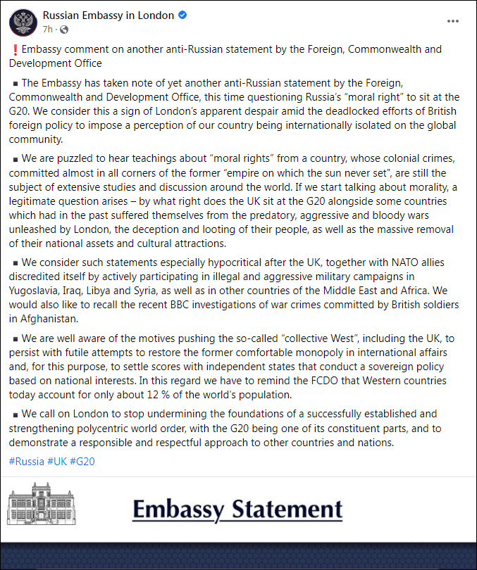 俄驻英大使馆表示,G20机制是成功建立和加强多中心世界秩序的基础之一,呼吁英方停止破坏这一机制,尊重其他国家和民族。