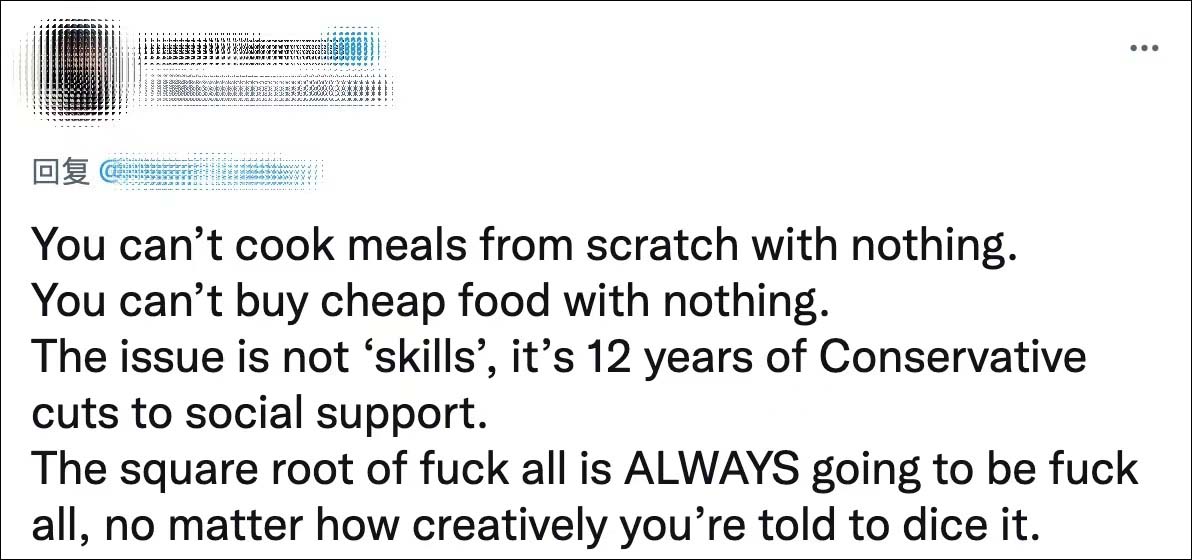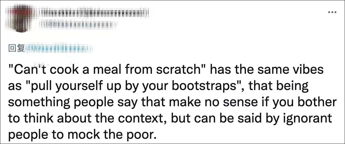 “吐槽人们不会做饭和劝大自力更生”一样,无知的人用这些话术嘲弄穷人”;