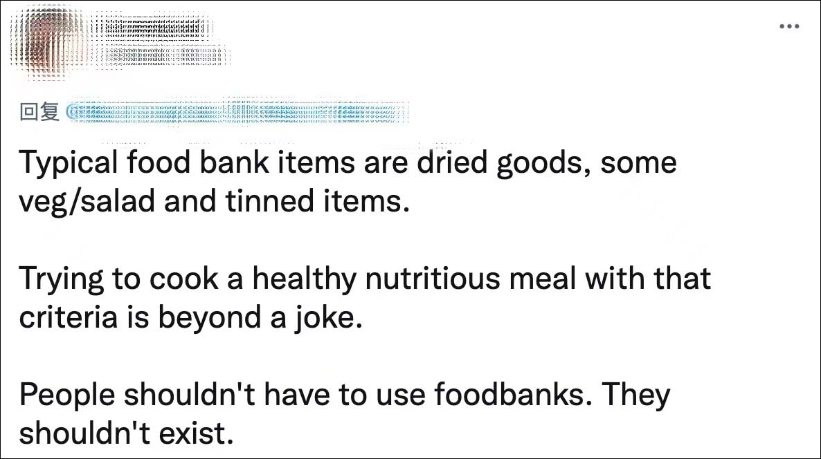 “食物银行提供的食物也基本都是干货,在这种情况下你跟我说健康又营养?的确,人们不应该使用食物银行,人们就不应该存在呗。”