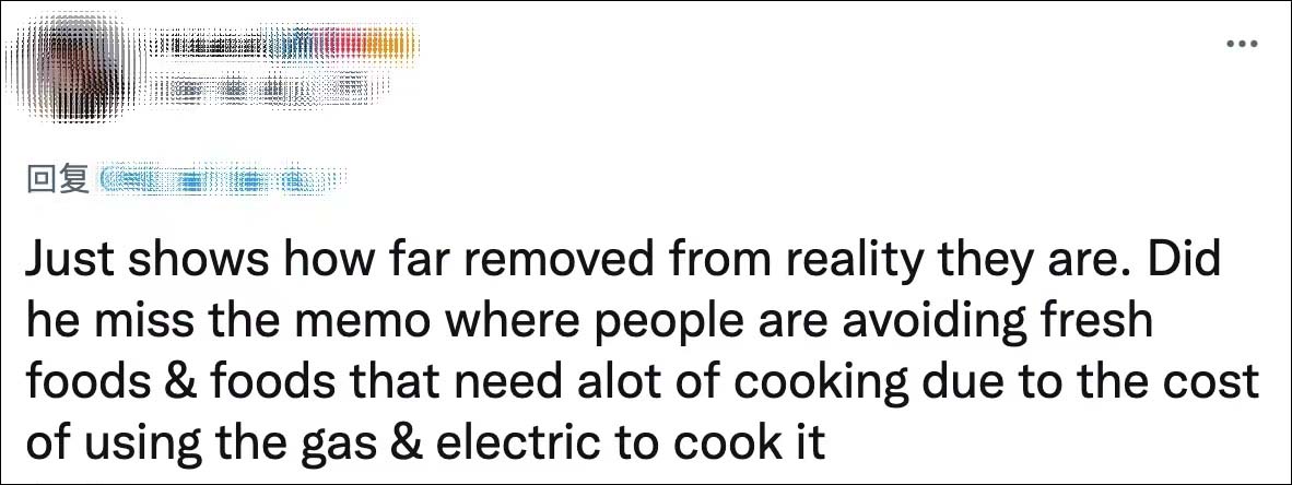 该言论在社交媒体上引发群嘲,有网民质问,“所有的物价都在上涨,一大堆生活开销要支付,大家买不起做饭的燃料,买不起做饭的食材,什么都没有,你不知道吗?”