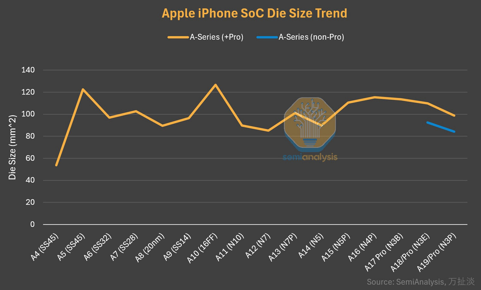 从具体数据来看,当前旗舰 A19 Pro 相比 A18 Pro 的封装面积缩小约 10%,由 105 平方毫米降至 98.6 平方毫米;而标准版 A19 相较前代 A18 的面积缩减幅度也达约 9%。 半导体分析机构 SemiAnalysis 评估认为,仅凭 N3E 升级到 N3P 的制程演进,理论上大约只能贡献 4% 左右的面积缩减,这意味着苹果在架构与版图层面额外做出了更大刀幅的优化调整。