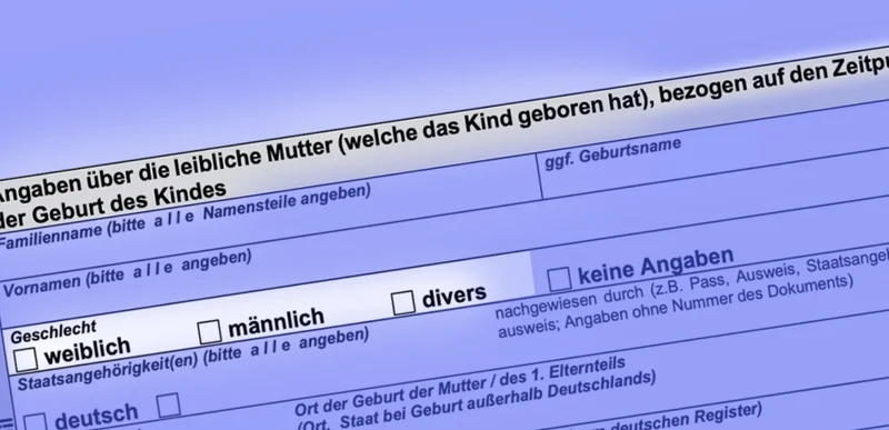 根据德国现行规定,拥有德国国籍的父母如果在国外生育子女,可以在德国户籍登记处为新生儿进行登记。外交部为此专门设计了一份表格,供父母向所属户籍登记处提交。如果父母虽持有德国国籍但从未在德国居住过,则需向柏林第一户籍登记处提交申请。然而,这份本应简单明了的行政表格,却在性别问题上设置了令人困惑的选项。