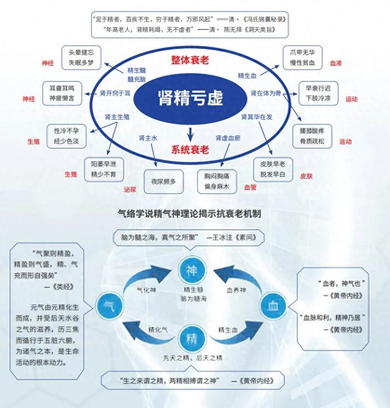 针对单一靶点的药物,往往陷入‘按下葫芦浮起瓢’的困境”,或因副作用难以长期应用,或因干预范围狭窄,难以实现整体健康的延展。与这一主流范式形成对照的是,八子补肾胶囊所依托的“气络学说精气神理论”。该理论由络病理论创新转化全国重点实验室及吴以岭院士团队系统构建,其创新之处在于,将中医数千年“肾为先天之本”“精气神一体”的生命整体观,与现代衰老生物学的前沿发现进行了创造性的融合与互释。