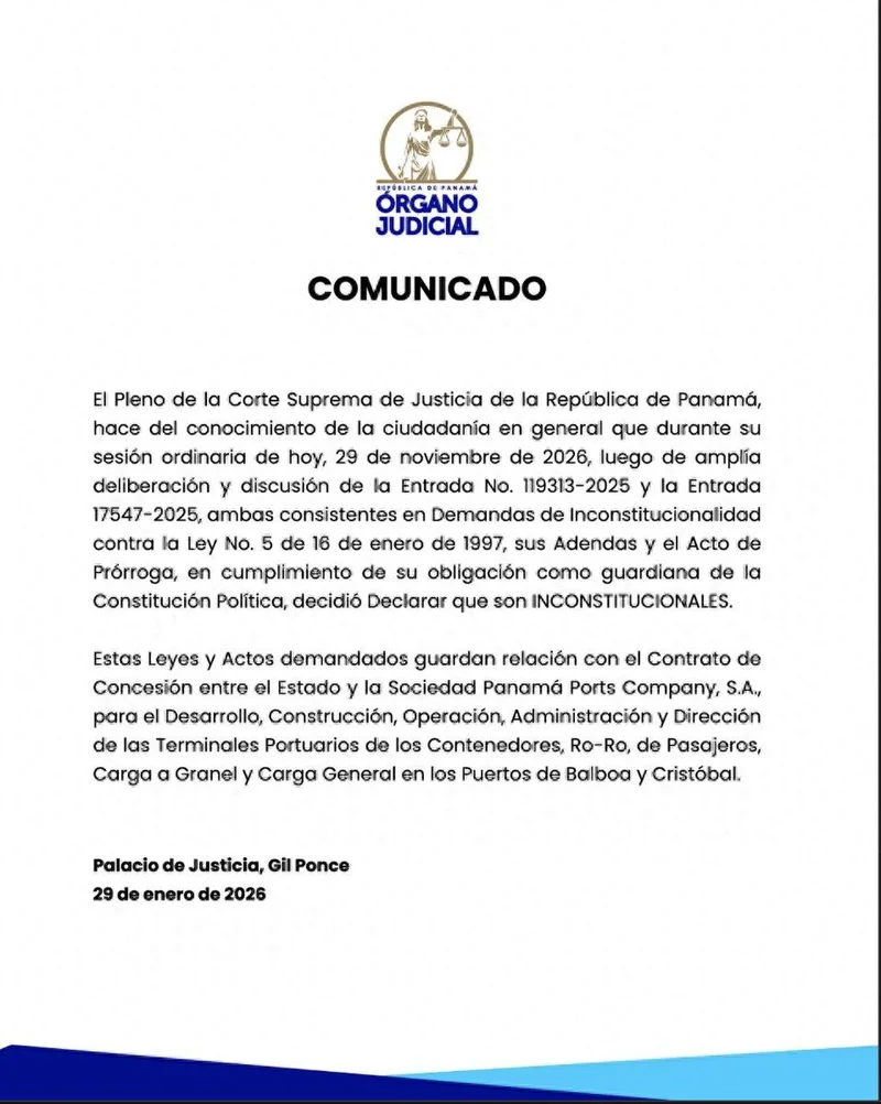 法院声明写道:“被裁定违宪的法律及法案涉及国家与巴拿马港口公司签订的特许经营权合同,该合同涵盖巴尔博亚港(Balboa)和克里斯托瓦尔港(Cristóbal)上集装箱、滚装船、客运、散货及杂货码头的开发、建设、运营、管理与维护事宜。”