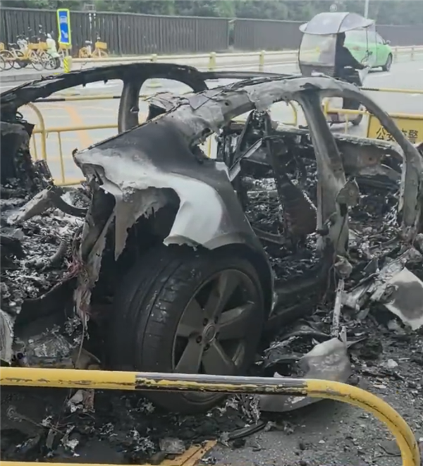 网友拍摄的视频显示,这辆保时捷Taycan起火时,车门均已打开,起火集中在车身中部,消防人员将明火扑灭后,车辆已被完全烧毁,变成空壳。