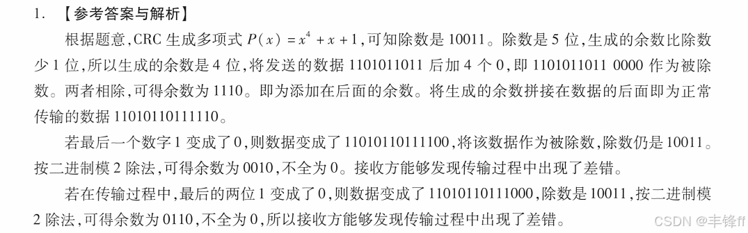 1.要发送的数据为 1101011011,采用 CRC 生成的多项式是P(x)=x4+x+1。试求应添加在数据后面的余数。数据在传输过程中最后一个 1 变成了 0,问接收端能否发现?若数据在传输过程中最后两个 1 都变成了 0,问接收端能否发现? 【中国科学院大学 2015 年】