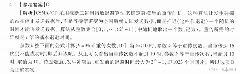 【解析】根据题意,平均一个网络层分组需要 10 个数据链路层帧来发送,而物理信道的传输成功率是 95%(即发送一个帧的成功率为 95%),采用无确认无连接服务,则成功发送 10 个数据链路层帧的成功率是 (0.95)^10≈0.598,即大约 60% 的成功率。所以选项 B 为正确答案。这个结论说明了在不可靠信道上无确认的传输效率很低,为了提高可靠性应该引入有确认的服务。2.要发送的数据为 110101011,采用 CRC 的生成多项式为G(X)=X4+X3+1,则冗余码是 ( )。