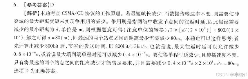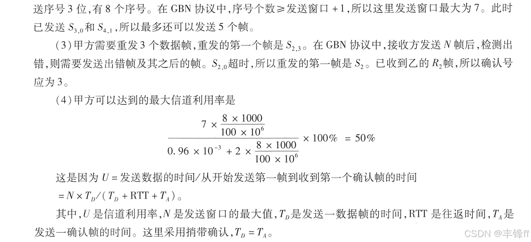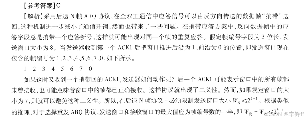 【解析】滑动窗口协议中发送窗口和接收窗口的序号的上下界不一定要一样,甚至大小也可以不同。不同的滑动窗口协议窗口大小一般不同。若采用 n 比特对帧进行编号时,发送窗口和接收窗口之和不大于 2n,题中 n=3,发送窗口大小为 5,所以接收窗口最大值为 23−5=3。所以选项 B 为正确答案。2.主机甲通过 128kbps 卫星链路,采用滑动窗口协议向主机乙发送数据,链路单向传播时延为 250ms,帧长为 1000 字节。不考虑确认帧的开销,为使链路利用率不小于 80%,帧序号的比特数至少是 ( )。 【全国统考 2015 年】