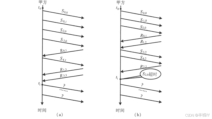 (1) 对于图 (a),t0时刻到t1时刻期间,甲方可以断定乙方已正确接收的数据帧数是多少,正确接收的是哪几个帧(请用Sx,y形式给出)?