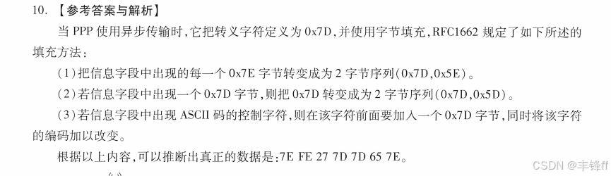 10.一个 PPP 帧的数据部分(用十六进制写出)是 7D 5E FE 27 7D 5D 7D 5D 65 7D 5E。试问真正的数据是什么(用十六进制写出)?