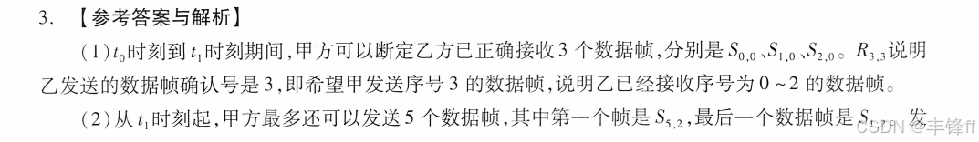 3.甲乙双方均采用后退 N 帧协议(GBN)进行持续的双向数据传输,且双方始终采用捎带确认,帧长均为 1000B。Sx,y和Rx,y分别表示甲方和乙方发送的数据帧,其中:x 是发送序号;y 是确认序号(表示希望接收对方的下一帧序号),数据帧的发送序号和确认序号字段均为 3 比特。信道传输率为 100Mbps,RTT = 0.96ms。下图给出了甲方发送数据帧和接收数据帧的两种场景,其中t0为初始时刻,此时甲方的发送和确认序号均为 0,t1时刻甲方有足够多的数据待发送。