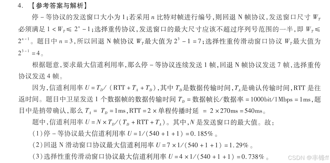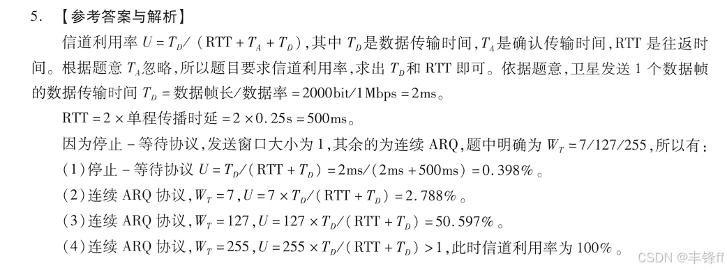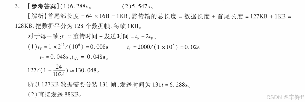 【解析】根据题意,首先考虑发送周期,开始发送帧到收到第一个确认帧为止,用时为 T= 第一个帧的传输时延 + 第一个帧的传播时延 + 确认帧的传输时延 + 确认帧的传播时延,这里忽略确认帧的传输时延。因此 T=1000B/128kb/s+RTT=0.0625s+250ms+250ms=0.5625s。