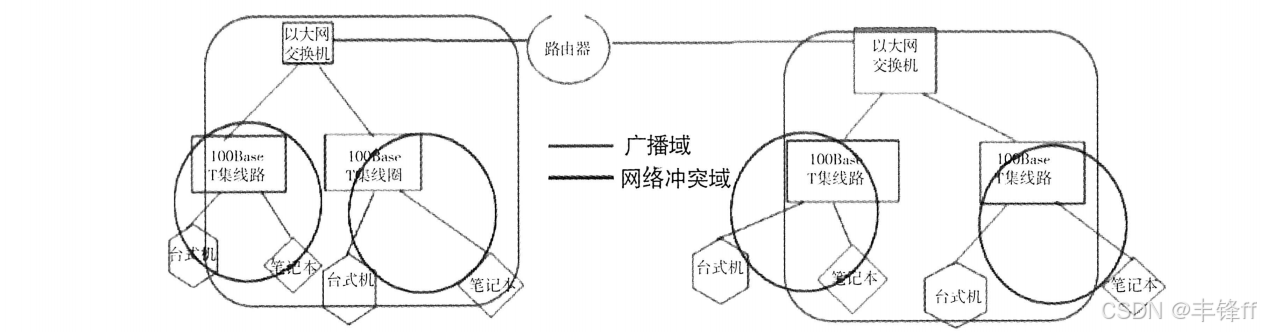 【解析】本题考查网络冲突域和广播域。网络层设备路由器可以隔离广播域和冲突域;数据链路层的设备普通交换机只能隔离冲突域;物理层设备集线器中继器既不能隔离冲突域也不能隔离广播域。题中共有 2 个广播域,6 个冲突域。故本题选 C。