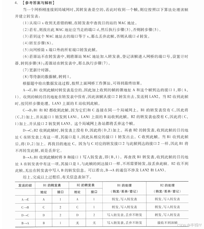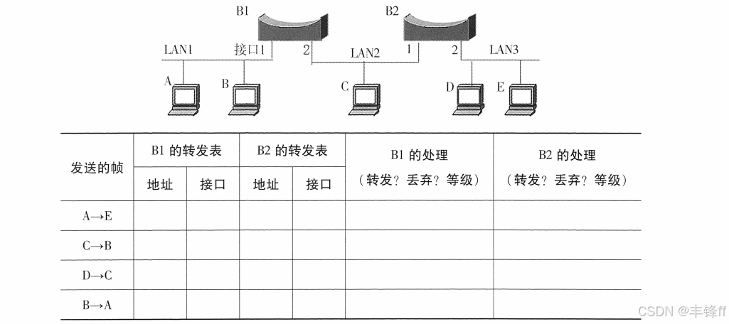 4.如下图所示,有 5 个站点分别连接在 3 个局域网上,并且用网桥 B1 和 B2 连接起来,每一个网桥都有 2 个接口(1 和 2),在一开始,两个网桥中的转发表都是空的。之后有以下各站向其他的站按先后顺序发送了数据帧:A 发送给 E,C 发送给 B,D 发送给 C,B 发送给 A。试把有关数据填写在下表中。